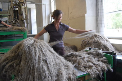 こうして出来上がった生地の縮絨(縮めること)をしたり、